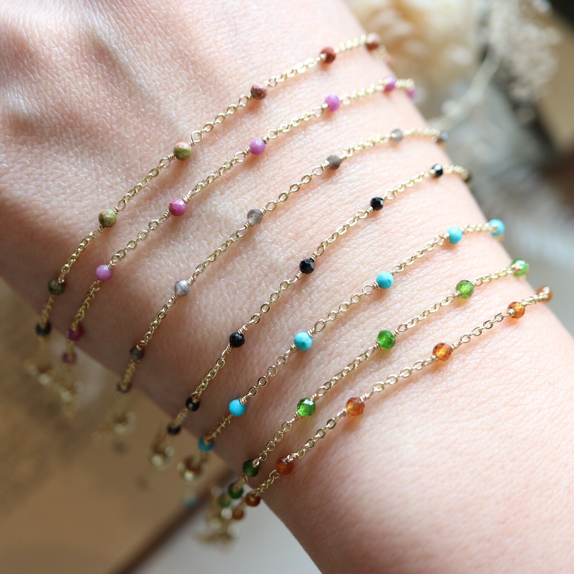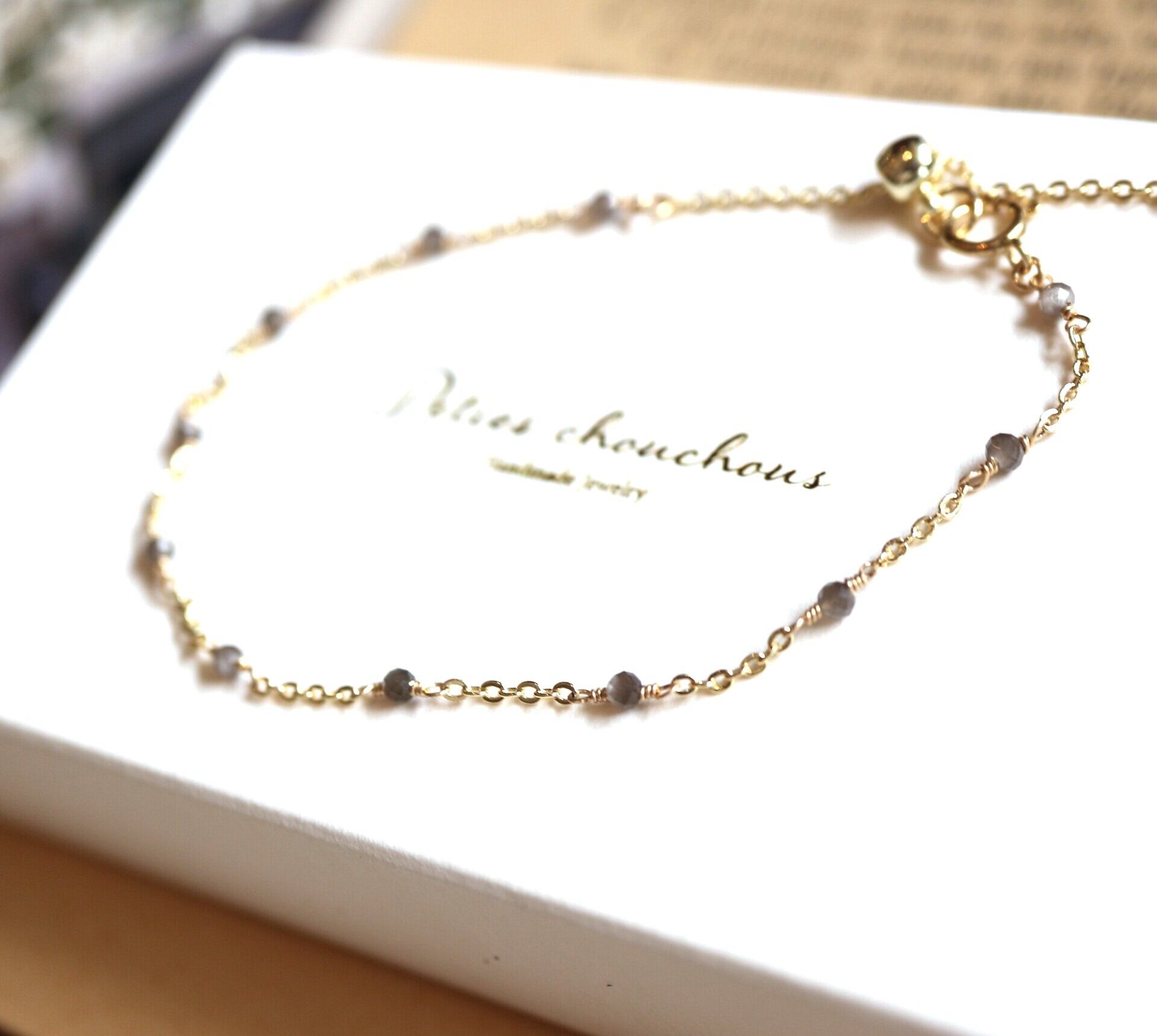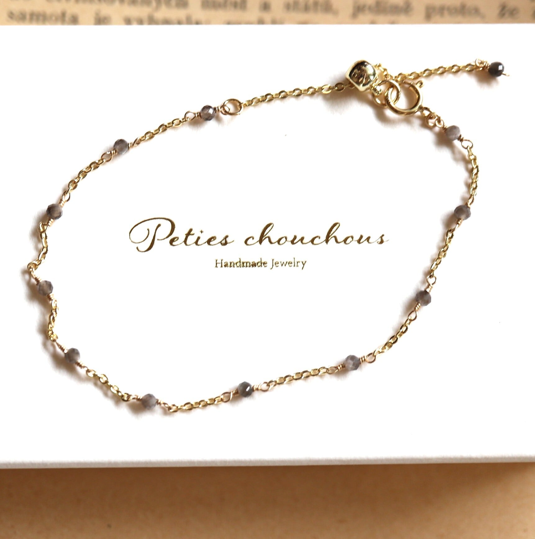 高級感溢れる14Kgf素材のチェーンに、約2ミリサイズのオブシディアンを連ねたシンプルに洗練された華奢なブレスレットです